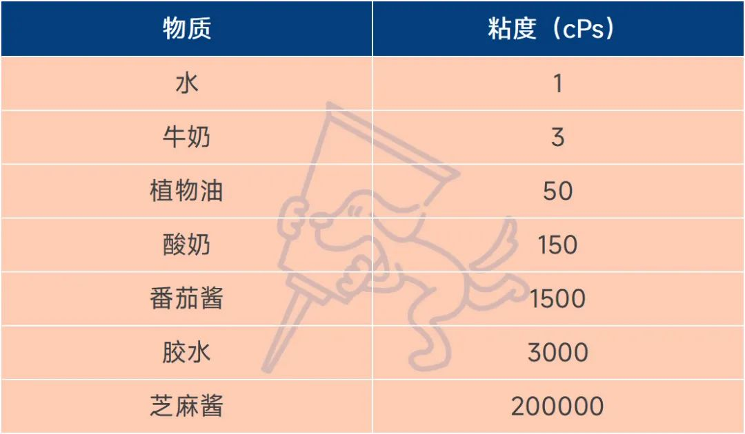 粘度表示液体对于流动所具有的内部阻力。简单来讲,粘度是指胶水稠还是稀的一个参数。粘度的单位是厘泊(cP)、泊(P)。其中水的粘度是1cP,是容易流动的。以下是我们常见的物质粘度值(供参考):